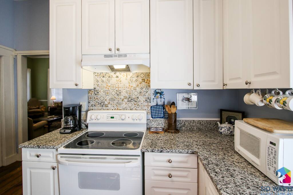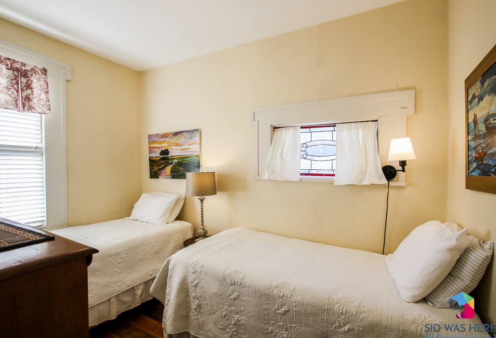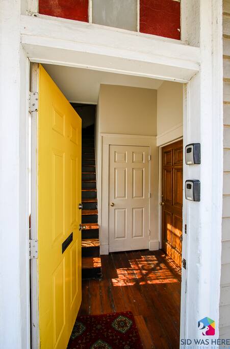 One entrance for both units. The Lower apartment features two bedrooms and one bathroom. The master bedroom holds a King size bed. The second bedroom has two twin beds. The bathroom in this unit has a toilet and shower, no bath tub. There is a washer and dryer for this unit, located next to the entry door. The Upper apartment features another two bedrooms and one bathroom. The master holds a king bed, and the second bedroom has a full size bed in it. The bathroom has a toilet and also a tub/shower combination. There is a pullout couch in the living room of the upstairs apartment. The private courtyard in the back is lovely any time of year and features seating and also a grill. Walk all over Savannah from this convenient location.