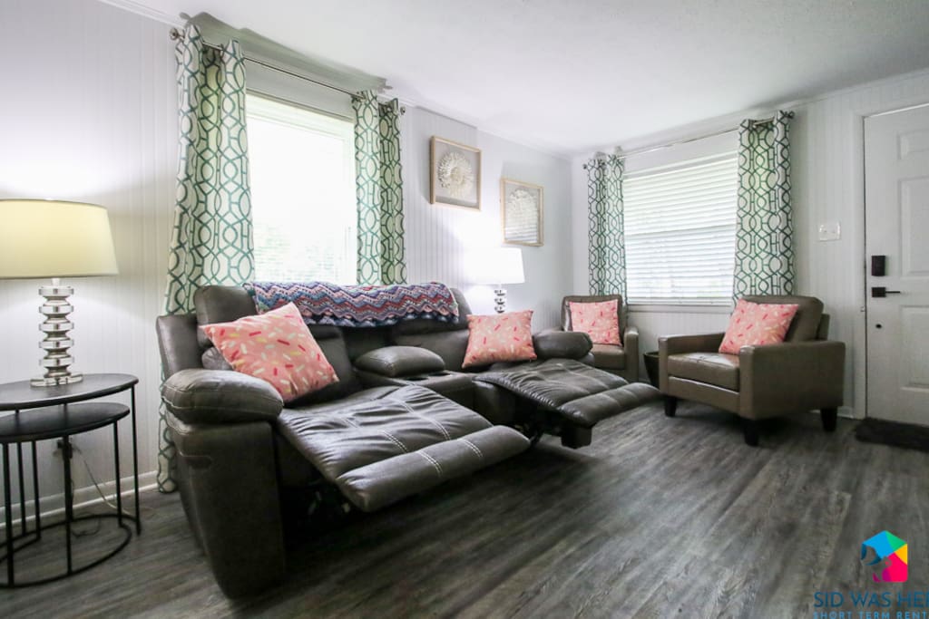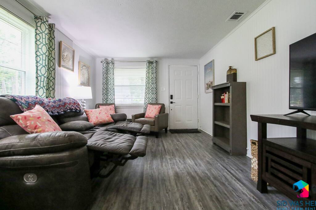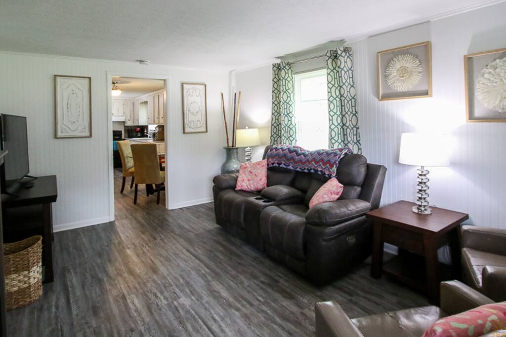 This cute bungalow lies in the western Savannah suburb of Pooler, just minutes from I-95 on the airport exit and close to the huge Tanger Outlets Mall. Up to four people can stay here; so can pets. The bungalow, with a funky “Cake” theme, lies about 45 minutes’ drive from downtown Savannah and an hour from Hilton Head Island for those weekend trips to the beach. Gulfstream and Caterpillar plants are also close by. Recently remodeled, all the furniture and mattresses are brand new.