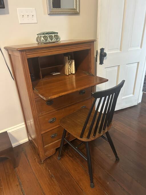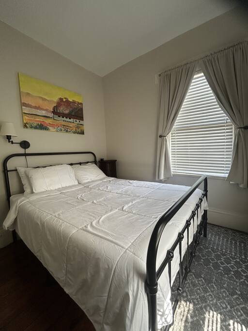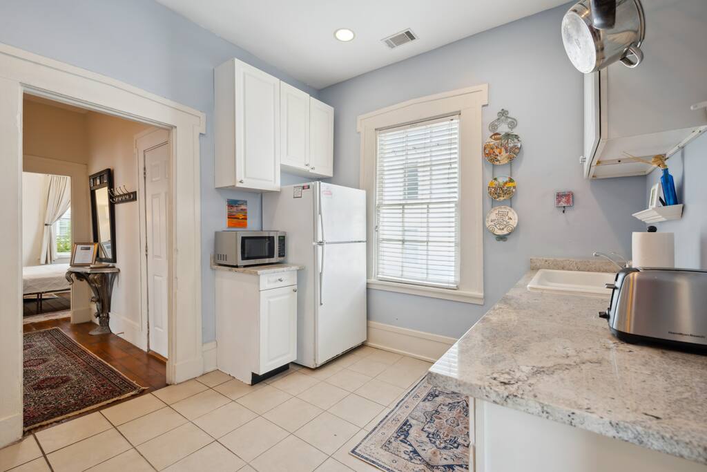 The home is a top/down duplex, and this listing covers the rooms in the upper-level apartment. The larger bedroom features a king-sized bed, while the other bedroom has a queen-sized bed. There is one full bathroom. The cozy kitchen is equipped with all the essential appliances for your stay. The spacious living room features a smart TV and comfortable seating for up to eight guests. For your convenience, a washer and dryer are also provided. The walls are adorned with the owner’s original artwork, and the windows offer charming views of the streets in Savannah’s historic district. Enjoy the convenience of free off-street parking, then unwind in the double courtyard adorned with string lights—the perfect setting for morning coffee or evening cocktails. Whether you’re visiting for a weekend getaway or an extended stay, you’ll feel right at home. Short-Term Vacation Rental Certificate: SVR-00005