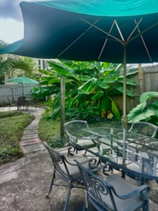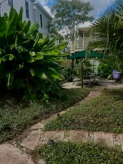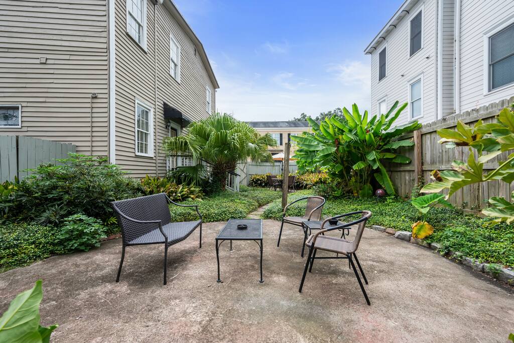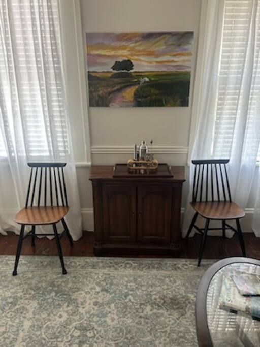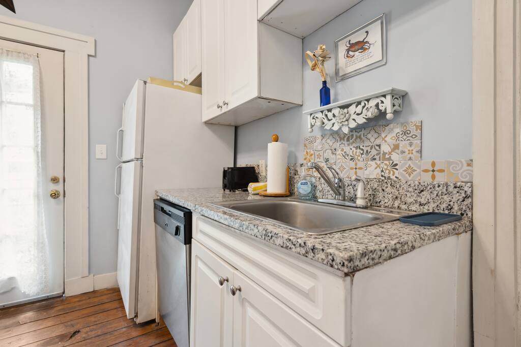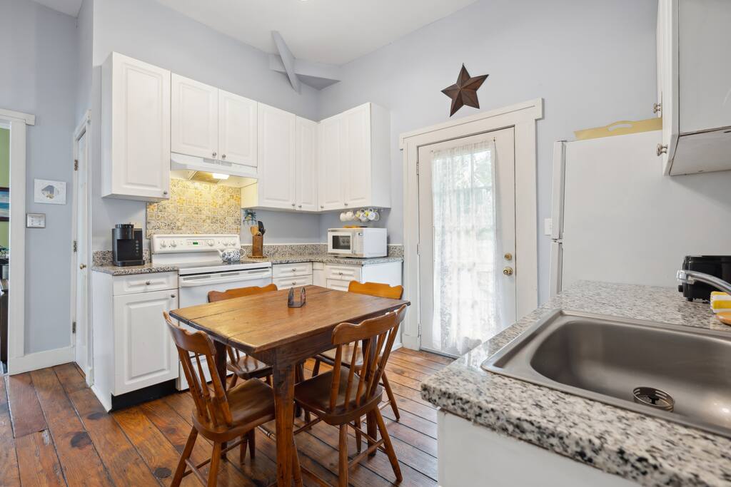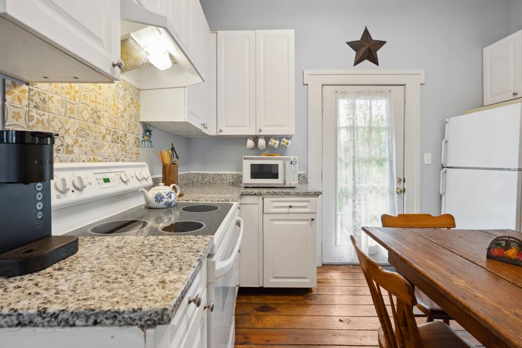 The home is a top/down, and this listing covers the rooms in the lower-level apartment. The larger bedroom features a queen-sized bed, while the other bedroom has two twin-sized beds. There is one full bathroom. The small kitchen has all the necessary appliances for your stay. There is a large living room with a smart TV and seating for eight. The walls are decorated with the owner’s artworks. Through the windows, you’ll see the streets of Savannah’s historic district beckoning. Enjoy the convenience of free off-street parking, then unwind in the double courtyard adorned with string lights—the perfect setting for morning coffee or evening cocktails. Whether you’re visiting for a weekend getaway or an extended stay, you’ll feel right at home. Short-Term Vacation Rental Certificate: SVR-00004