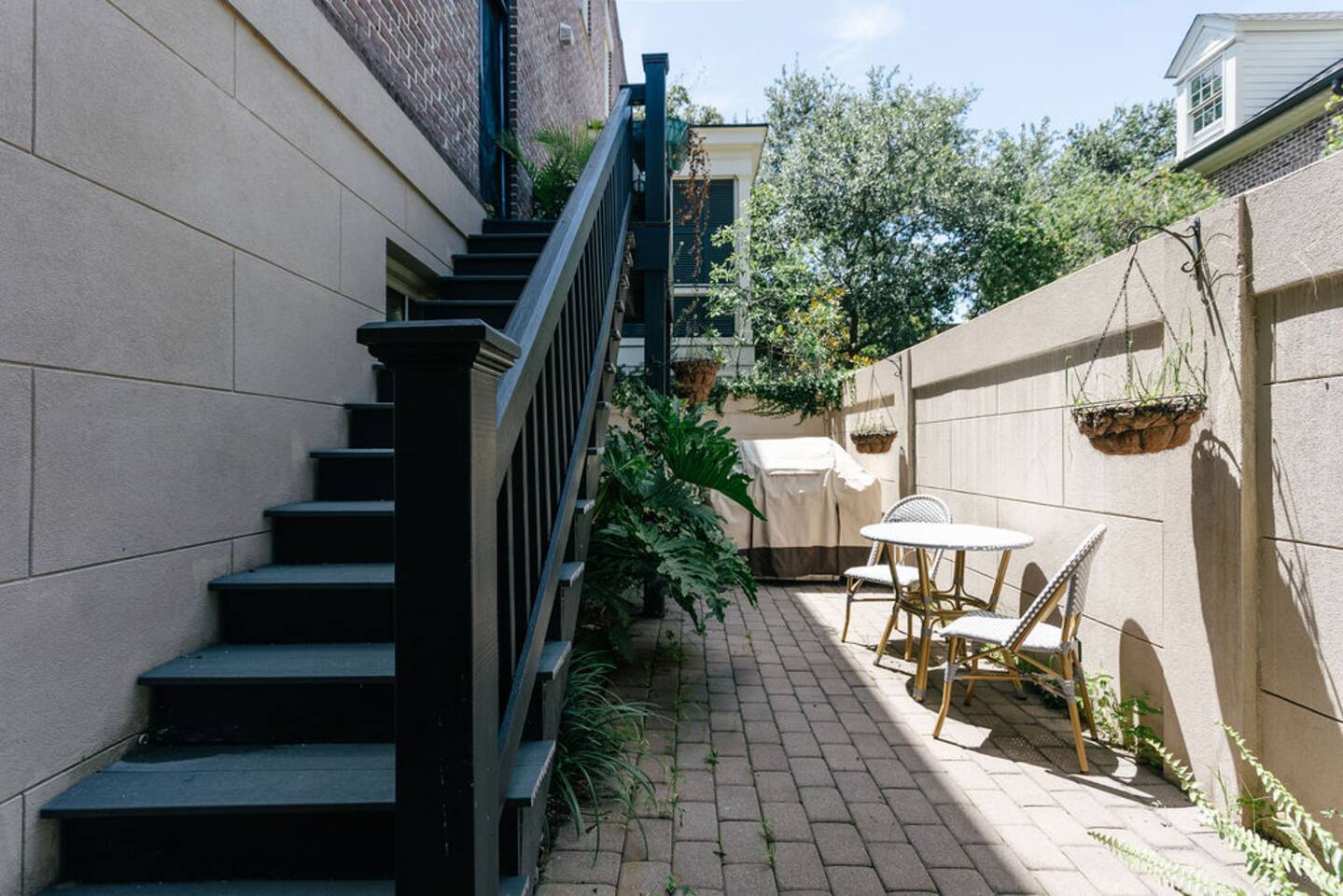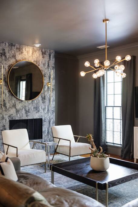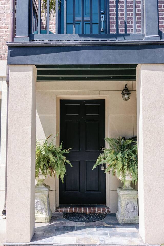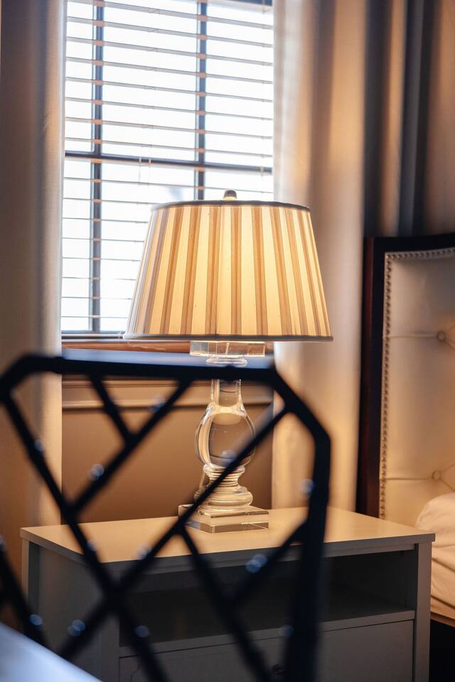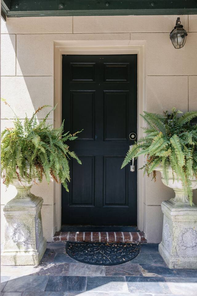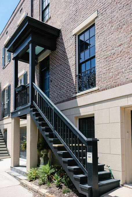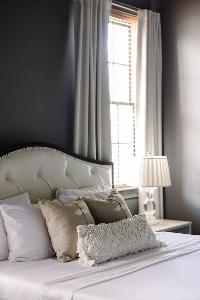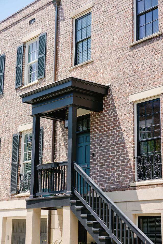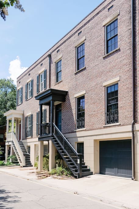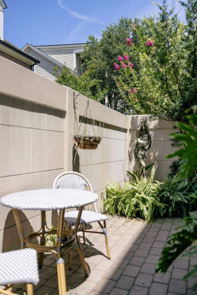 The Space Main House (Sleeps 4): 2 elegant ensuite bedrooms, each with: King bed, luxury linens Blackout curtains & adjustable ceiling fans Primary bathroom with soaking tub and large walk-in closet Bright living room with smart TV Fully equipped kitchen with modern appliances Dining area with seating for 6+ Half bathroom for guests Garden Apartment (Sleeps 2–4): Queen bed with high-quality bedding Double pull-out sofa bed (great for kids or short stays) Fully appointed kitchenette Private bathroom In-unit washer/dryer Access to shared courtyard with the main house Note: Garden apartment can sleep 4, but ideal for quiet stays—no parties, please. Outdoor Living Charming courtyard with patio seating Historic brick surroundings and lush greenery Perfect for morning coffee or a glass of wine after exploring Location Highlights 2-minute walk to Chatham Square 6-minute walk to Forsyth Park Close to shops, restaurants, museums, and trolley stops Tucked away in a peaceful block just south of Liberty, offering the perfect balance of walkability and quiet Amenities High-speed Wi-Fi Smart TVs Central A/C & heat Towels, linens, shampoo & soap provided In-unit laundry (both main house & apartment) Professionally cleaned prior to each stay Sleeping Arrangements Bedroom 1 (Main House): King bed + ensuite Bedroom 2 (Main House): King bed + ensuite Studio Apartment: Queen bed + pull-out double sofa bed
