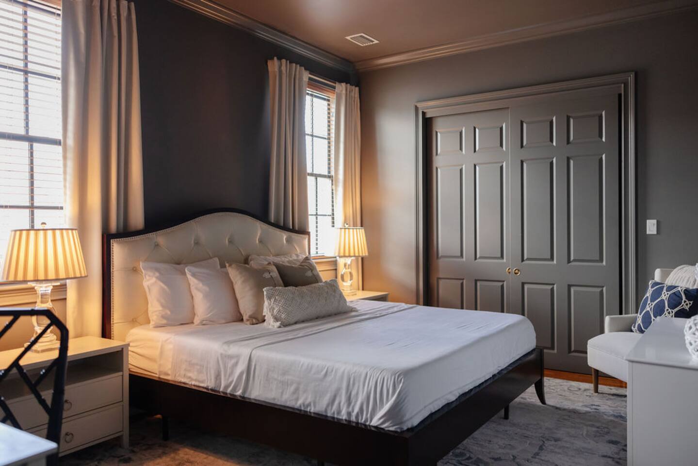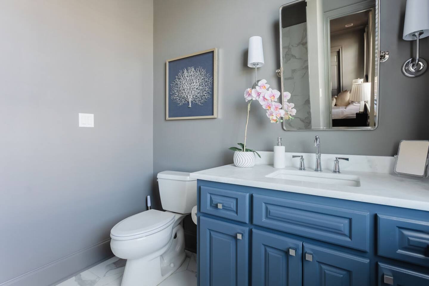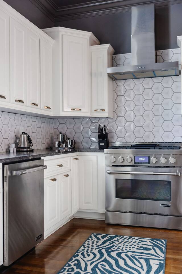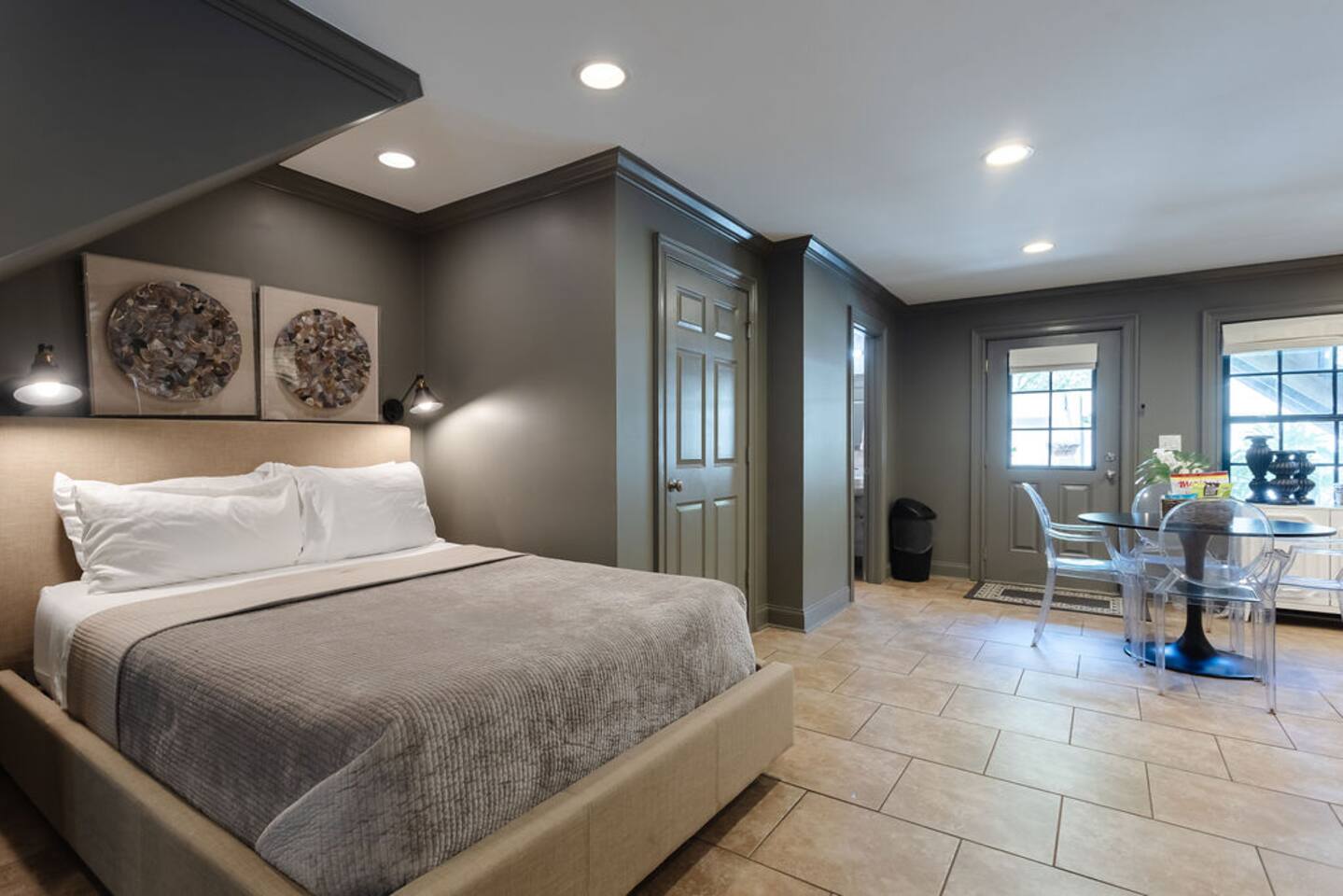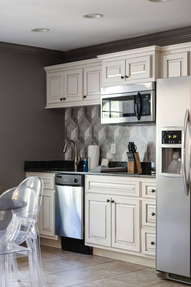The Space Main House (Sleeps 4): 2 elegant ensuite bedrooms, each with: King bed, luxury linens Blackout curtains & adjustable ceiling fans Primary bathroom with soaking tub and large walk-in closet Bright living room with smart TV Fully equipped kitchen with modern appliances Dining area with seating for 6+ Half bathroom for guests Garden Apartment (Sleeps 2–4): Queen bed with high-quality bedding Double pull-out sofa bed (great for kids or short stays) Fully appointed kitchenette Private bathroom In-unit washer/dryer Access to shared courtyard with the main house Note: Garden apartment can sleep 4, but ideal for quiet stays—no parties, please. Outdoor Living Charming courtyard with patio seating Historic brick surroundings and lush greenery Perfect for morning coffee or a glass of wine after exploring Location Highlights 2-minute walk to Chatham Square 6-minute walk to Forsyth Park Close to shops, restaurants, museums, and trolley stops Tucked away in a peaceful block just south of Liberty, offering the perfect balance of walkability and quiet Amenities High-speed Wi-Fi Smart TVs Central A/C & heat Towels, linens, shampoo & soap provided In-unit laundry (both main house & apartment) Professionally cleaned prior to each stay Sleeping Arrangements Bedroom 1 (Main House): King bed + ensuite Bedroom 2 (Main House): King bed + ensuite Studio Apartment: Queen bed + pull-out double sofa bed