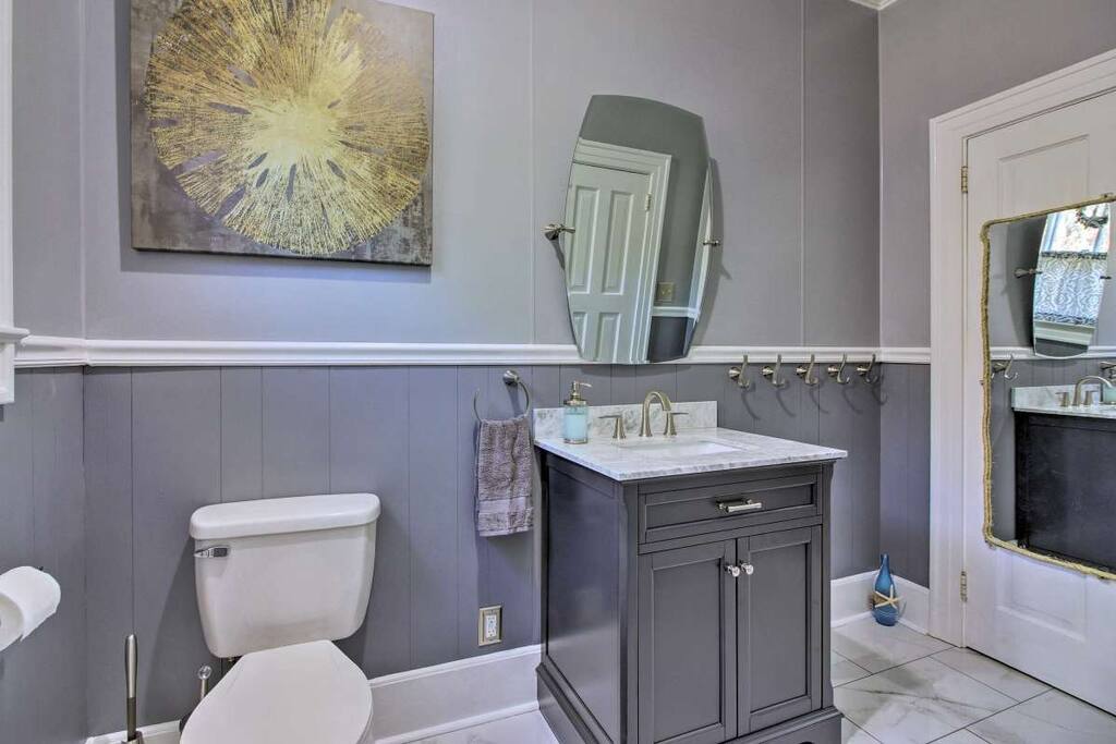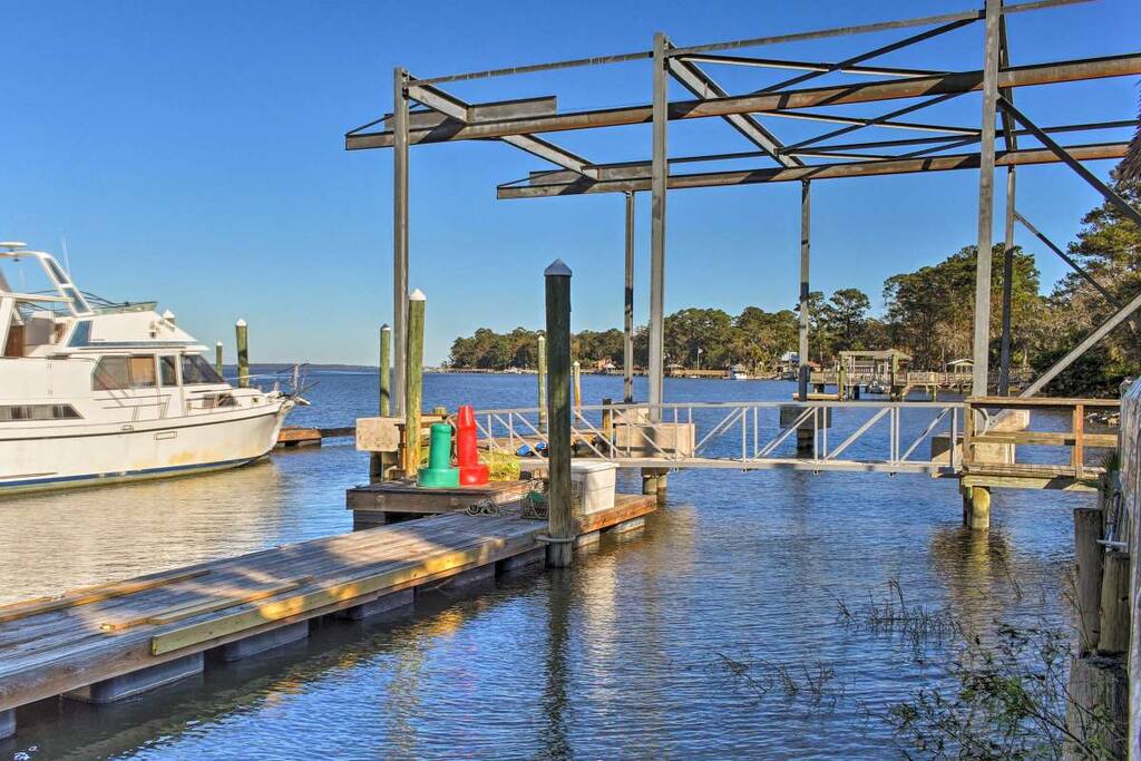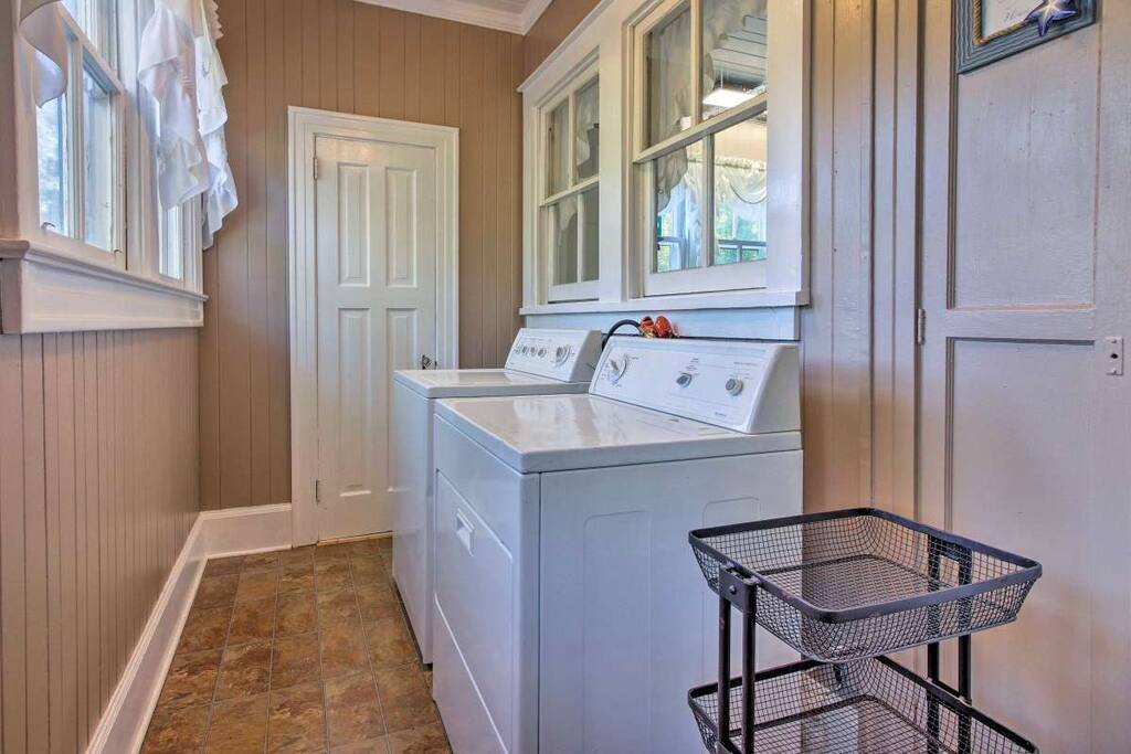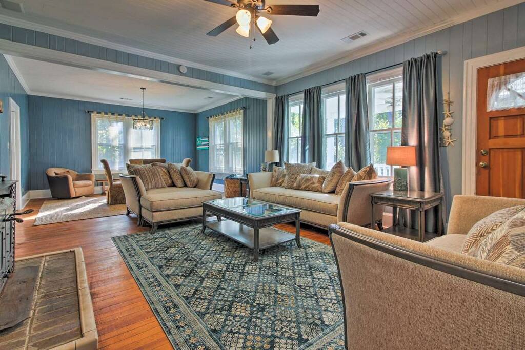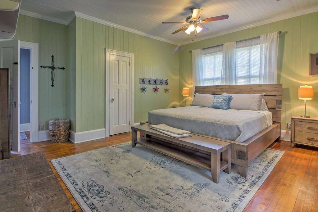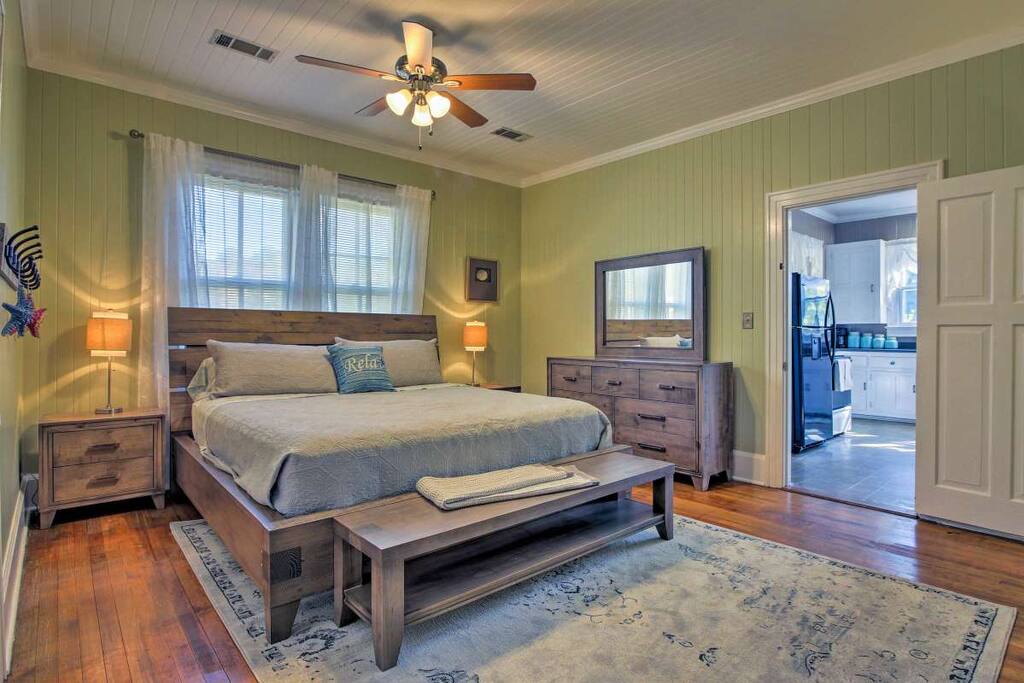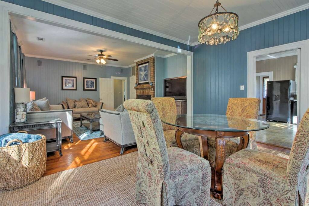 Surrounded by Spanish-moss-draped pines and close to recreation and historic sites, this home dates back to the early 1940s, when industrialist Henry Ford developed the Richmond Hill area. It lies about 35 minutes’ drive from downtown Savannah and just steps from the Myrtle Grove Plantation, where many movies and TV series have been filmed. Newly renovated, yet preserving the charm of yesteryear, guests will feel right at home as will well-behaved pets.