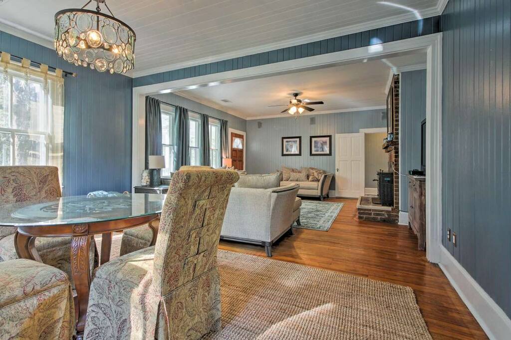 The home has 3 bedrooms and sleeps 10. The back yard is huge – big enough to park boats and multiple vehicles. The living area is quiet, private, and surrounded by trees on a 4-acre lot. The primary bedroom has a king-sized bed. A second bedroom has 2 double beds, and a third bedroom has 3 twin-sized beds. There is one bathroom. This is a one-story home, and the bedrooms wrap around a central hallway – from which a lone fireplace heated the home back in the day. The kitchen is original to the home and features beautiful views of pine woods. It has a refrigerator, stove and nice-sized pantry. There is no dishwasher in keeping with the kitchen’s historic nature. The dining room has a chandelier and glass-topped table and seats 8. The home sits on a 4-acre lot. The back yard has a picnic table, patio furniture and a fire pit for outdoor gatherings. The Starfish House was originally built in the 1940's on the Ford Plantation, owned by Henry Ford. The house was later moved to its current location. This area has been home to many films shot a few yards away at the Myrtle Grove Plantation. Films shot here include Glory, 7 Years a Slave, The Underground Railroad, and many others. Just down the street is a boat ramp to put boats in the Ogeechee River (the ocean is just 4 miles away) as well as Fort McAllister State Park, which includes the site of the last battle before the fall of Savannah in the Civil War, as well as a campground and recreation area. A dog park, tennis courts, and an exercise trail are also close by. This property sleeps 9 beds. There are very comfortable couches that would accommodate children.