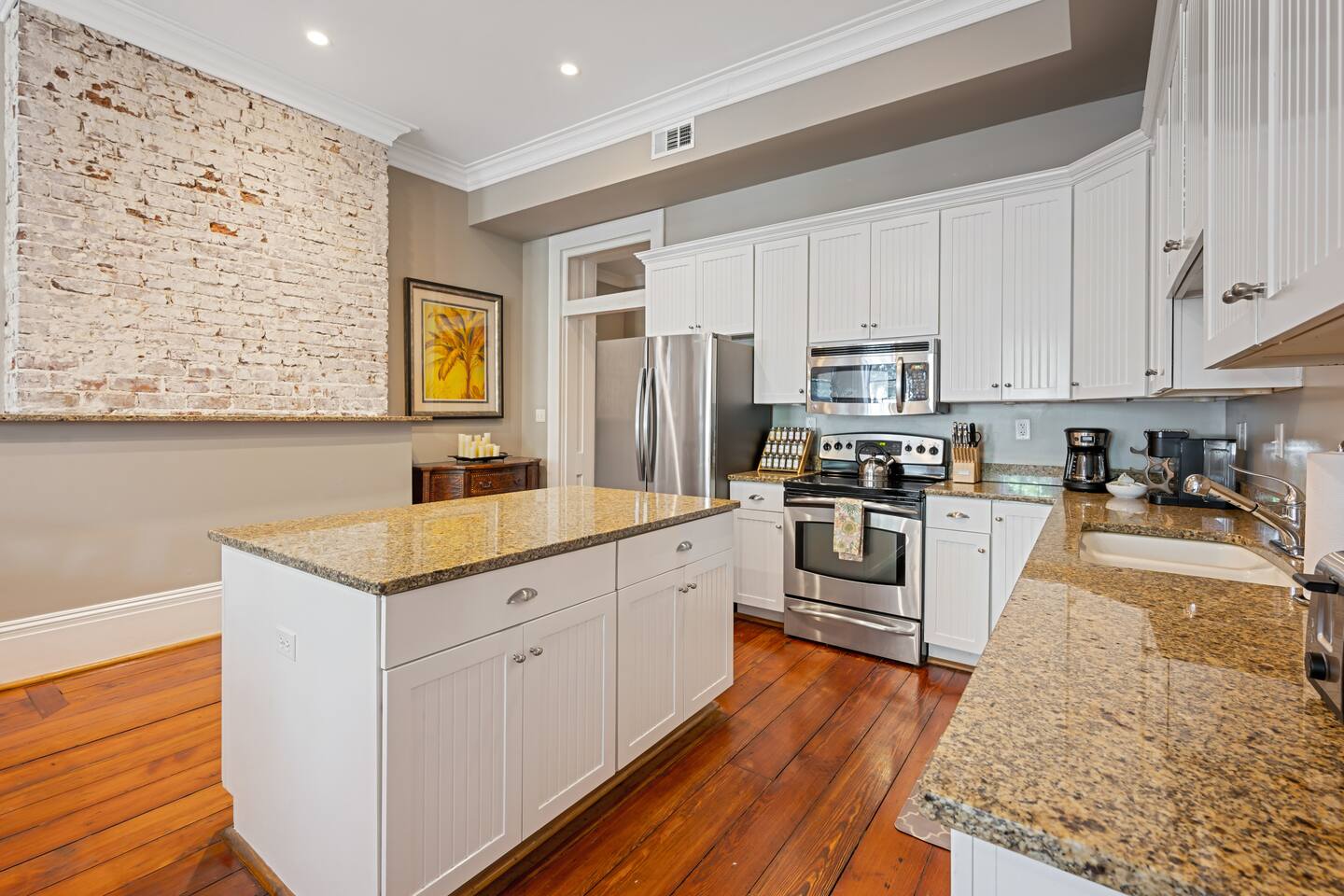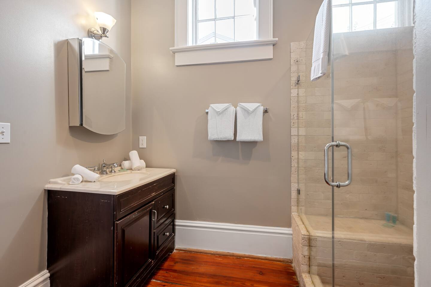 7 bedrooms, 5 bathrooms in a completely walkable location in Savannah's Historic District. 3 king beds, all ensuite and 4 queen beds await you here! Spacious living and dining areas and luxury linens. This unit is made up of the combination of two lower apartments in this ginormous, historic home. Book today!
