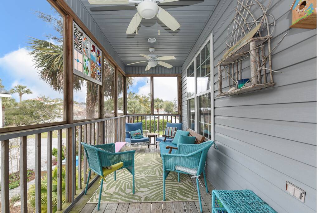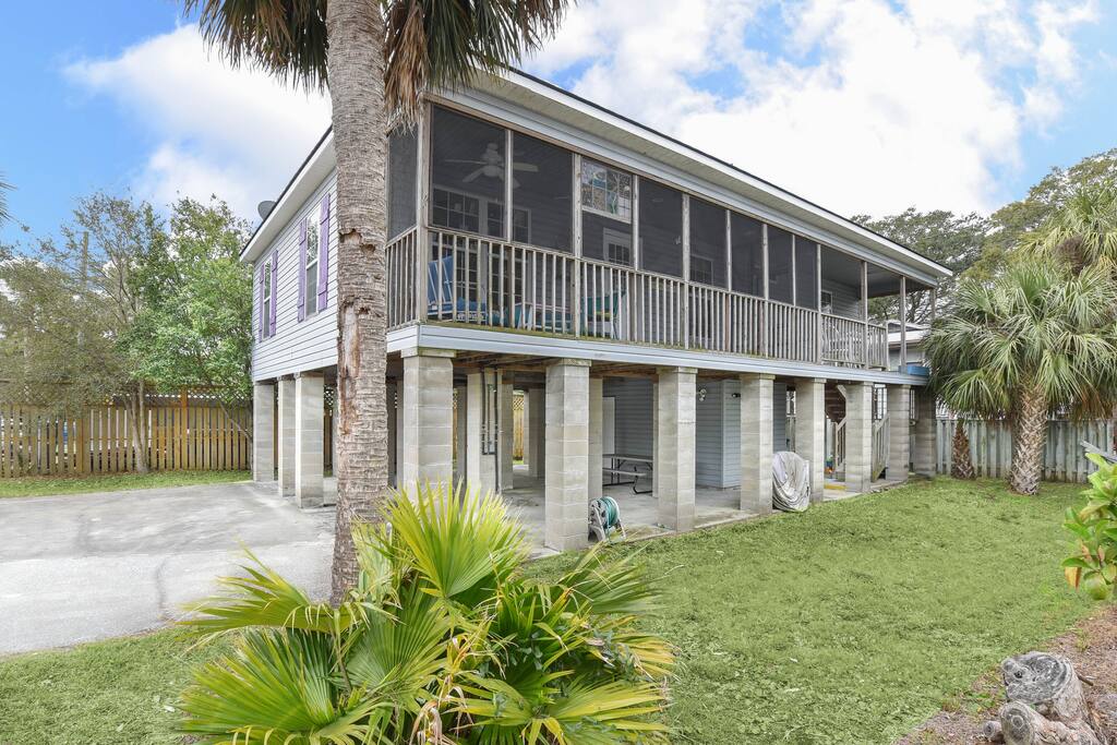 The home has three bedrooms: the master bedroom has a king-sized poster bed; another has two double beds, and the third has a queen bed and a twin. There are full-sized bathrooms. The living room is huge, with plenty of room for each member of the group to stretch out after a long day in the waves. The dining room has a six-top dining table. There is a full kitchen with all the appliances of home. Outside there is a wrap-around, screened-in porch with patio furniture. There are two outdoor showers to wash off the sand before going inside. This house is oriented toward families. A crib is available for infants, and there are two high chairs for toddlers as well. The walk to the beach is a mere 10 minutes–it is a 2-minute drive. Guests may rent a golf cart for the duration of their stay and take it everywhere on the island.